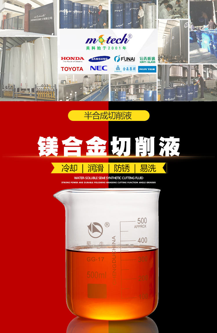 含有特效防氧化成份,针对镁合金的氧化性和燃烧性而设计,使镁合金加工后表面光洁,不变色可有效杜绝发黑等氧化变色现象。适用于镁、铝、有色金属及其合金的研磨、切削、攻丝、钻孔、冲压等作业,亦适用于镁合金线切割加工.