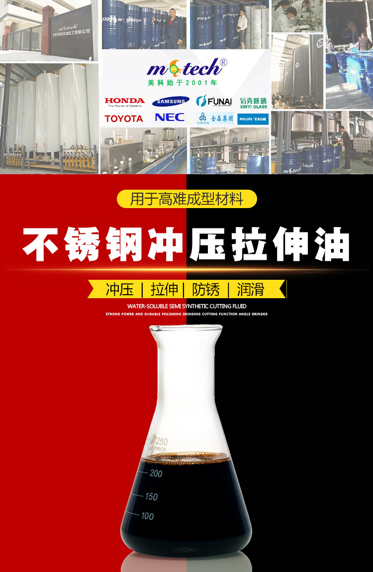 美科不锈钢拉伸油,含大量极压剂,特别用于高难度成型,如不锈钢、钛、合金钢、表带、表壳的冲压加工.