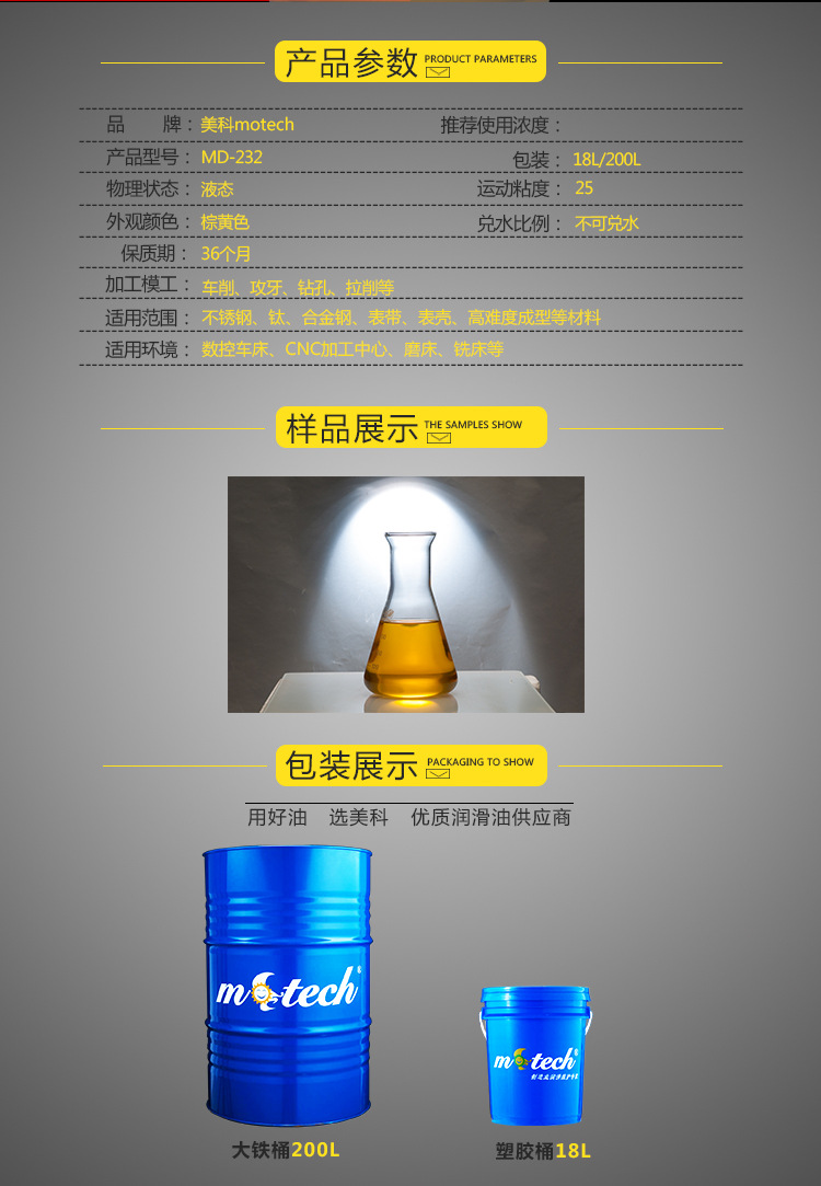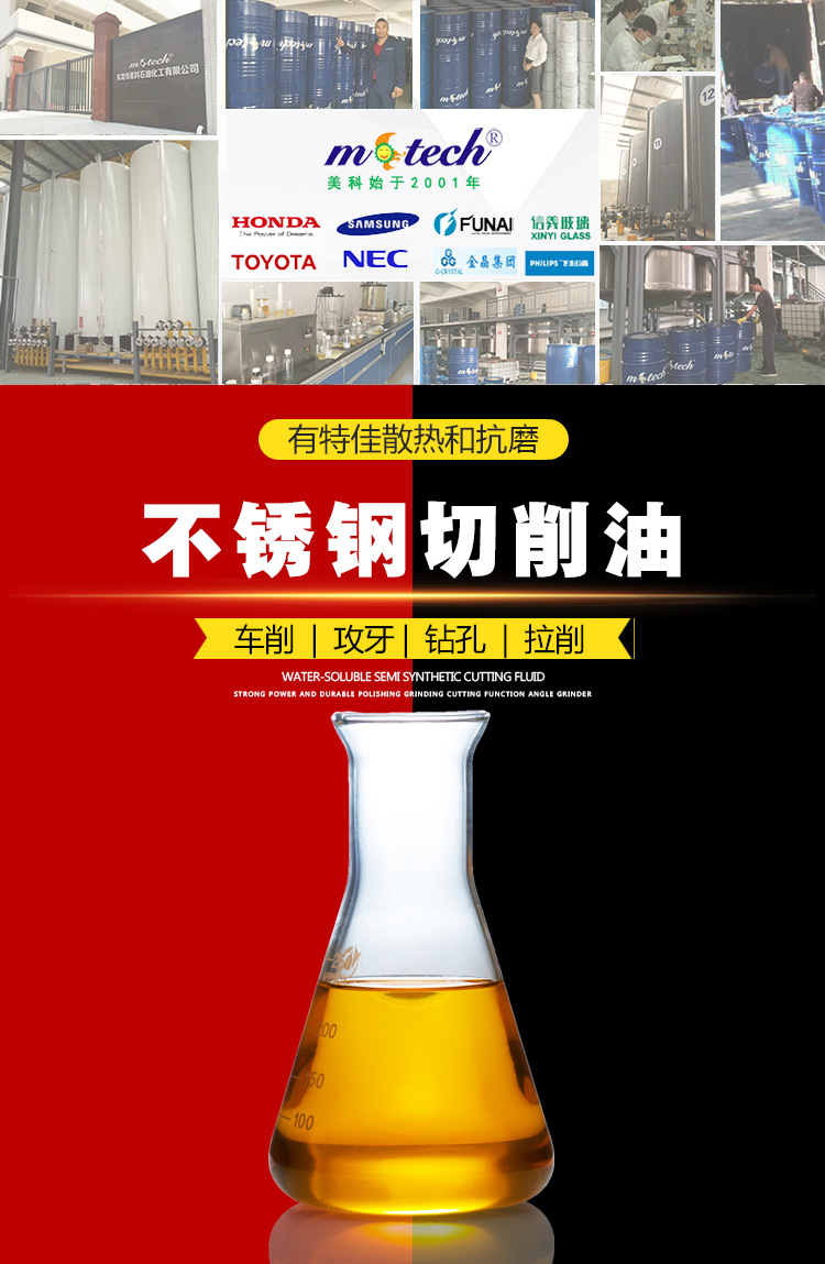 东莞美科不锈钢切削油,是一款高速极压的切削油,主要用于不锈钢或坚硬金属,车削、攻牙、钻孔、拉削等最荷刻的工序,具有特佳散热和抗磨损效果,对刀具磨损小,可有效延长刀具使用寿命,提升工作效率,节约生产加工成本。